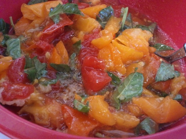 Mix together bruschetta ingredients and let sit for 30 minutes so the flavors intermingle.